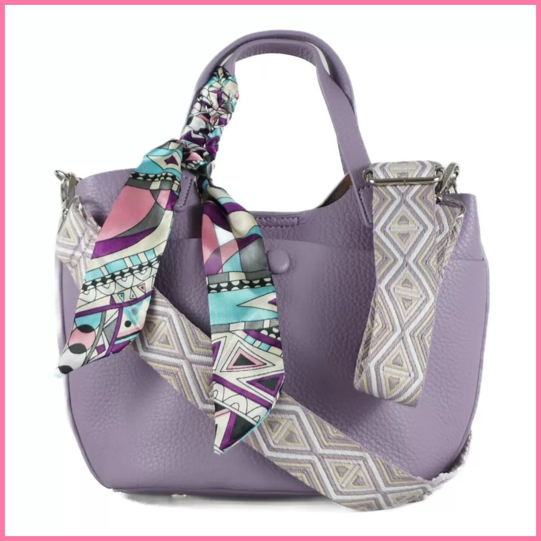 Csinos női kézitáska szalaggal, műbőrből. Elején széles zseb, mely mágneses patenttal nyílik. Tetején szintén mágneses patenttal nyílik, belül cipzáras táskarendező. Tartozéka egy tetszetős vállpánt. Méretei: 30×20×13 cm.