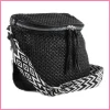 Tágas kistáska rafiával, poliészterből. Biztonsági öv jellegű pántja kényelmes és divatos. Belül egyterű, 1 cipzáras és 1 benyúlós zseb. Méretei: 23×18×12 cm.